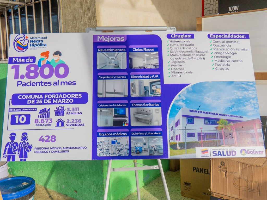 La Maternidad Negra Hipólita tendrá una transformación integral, donde se tiene proyectado realizar: revestimiento de paredes, intervención integral en áreas críticas, pintura, techos de PVC, renovación de sistemas sanitarios y una dotación de tecnología de punta para cuidados neonatales, quirófanos y laboratorios, asegurando una operatividad clínica de primer nivel.