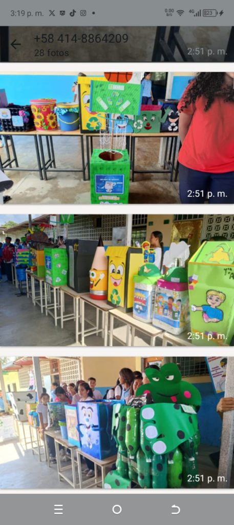 Elianyelis Silva, estudiante del segundo año sección A, dijo que realizaron una papelera que lleva por nombre «La Pluma Mágica» que tiene una base, un tobo de pintura forrada con revistas tejidas, adornos de ramas secas, flores hechas de cartón de huevos, pedazos de vidrios, plástico, y otros materiales.
