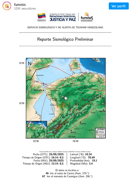 La Fundación Venezolana de Investigaciones Sismológicas (Funvisis) informó que este lunes se registró un sismo de magnitud 3,4 en el oeste de Carora, estado Lara, y otro de 3,1 al oeste de La Ceiba en Trujillo.