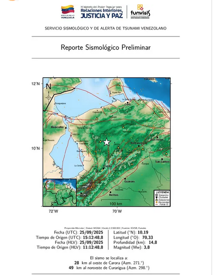 A través de su página web, el instituto también informó que se generó otro temblor a las 11:12 a.m. de magnitud 3.8 al oeste de Carora.