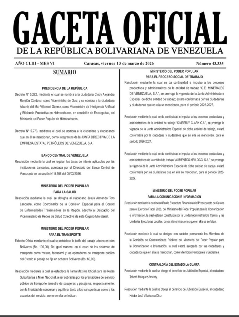 En el municipio Caroní, autoridades de transporte confirmaron la entrada en vigencia del nuevo ajuste en la tarifa del transporte público urbano a 100 bolívares, establecido en la Gaceta Oficial 43.335 de fecha 13 de marzo de 2026.