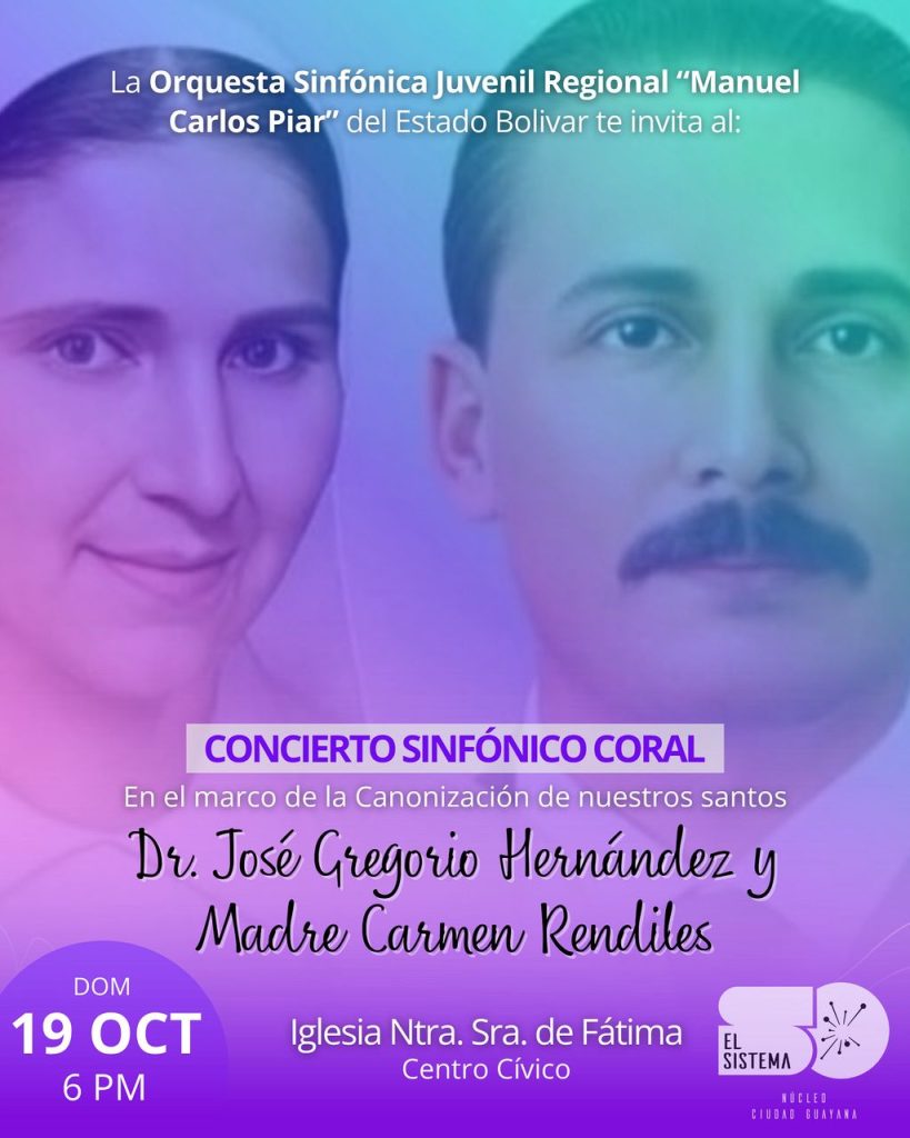 • 6:00 p.m.: Concierto de Música Sacra a cargo de la Orquesta Sinfónica Juvenil de Ciudad Guayana.