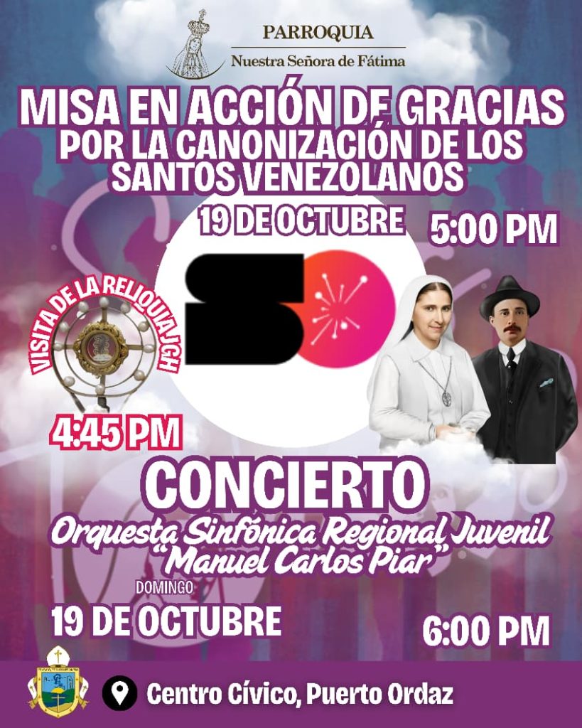 Ciudad Guayana, 18 de octubre de 2025.- La comunidad católica de Ciudad Guayana se prepara para una jornada de profunda fe y celebración. El domingo 19 de octubre, la parroquia Procatedral Nuestra Señora de Fátima, en Puerto Ordaz, llevará a cabo una Solemne Eucaristía de Acción de Gracias con motivo de la canonización de la Madre Carmen Rendiles y del Dr. José Gregorio Hernández, los primeros santos venezolanos.