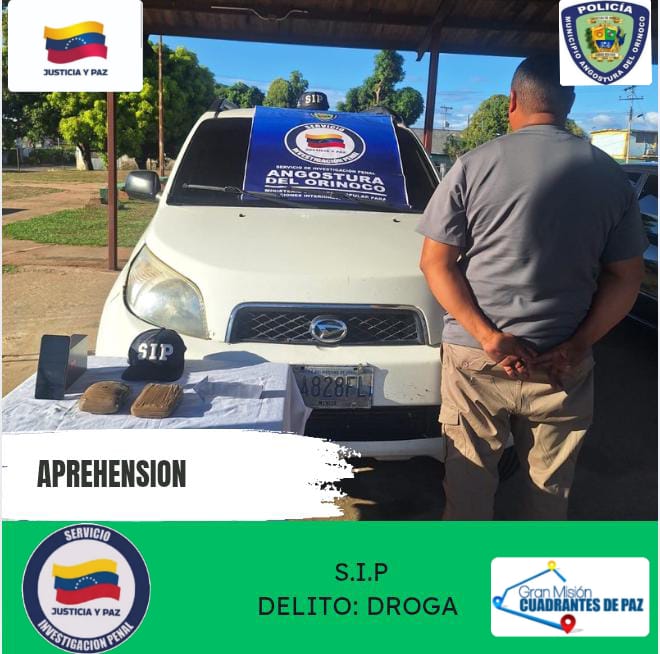 Durante un operativo realizado por el Servicio de Investigación Penal de la Policía Municipal Angostura del Orinoco (SIP-PMAO), funcionarios lograron la captura de un ciudadano de 37 años de edad, a quien se le incautó un cargamento de presunta droga tras una persecución en la capital bolivarense.