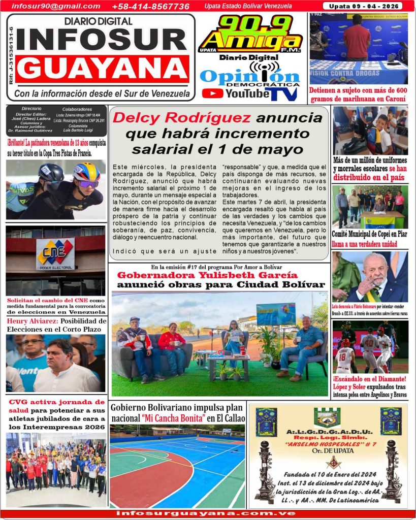 EDICION DIGITAL *Portada del Diario Digital InfoSur Guayana del día Jueves 09 – 04 – 2026* *Descarga nuestra edición en PDF* INFOSUR 09/04/2026 0 Portada INFOSUR DIGITALDescarga Post navigation Previous: Comité Municipal de Copei en Piar llama a una verdadera unidadNext: Alcalde Vicente Rojas acompaño al Ministro Héctor Rodríguez a un recorrido por la U.E.N. Luisa Cáceres de Arismendi en Tumeremo. Más historias EDICION DIGITAL *Portada del Diario Digital InfoSur Guayana del día Miércoles 15 – 04 – 2026* *Descarga nuestra edición en PDF* INFOSUR 15/04/2026 0 EDICION DIGITAL *Portada del Diario Digital InfoSur Guayana del día Martes 14 – 04 – 2026* *Descarga nuestra edición en PDF* INFOSUR 14/04/2026 0 EDICION DIGITAL *Portada del Diario Digital InfoSur Guayana del día Lunes 13 – 04 – 2026* *Descarga nuestra edición en PDF* INFOSUR 12/04/2026 0 Deja un comentario Cancelar la respuestaLo siento, debes estar conectado para publicar un comentario.