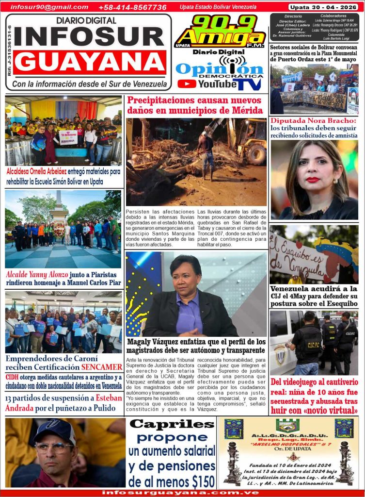EDICION DIGITAL *Portada del Diario Digital InfoSur Guayana del día Jueves 30 – 04 – 2026* *Descarga nuestra edición en PDF* INFOSUR 30/04/2026 0 Portada EDICIÓN DIGITAL INFOSURDescarga Post navigation Previous: Sectores sociales de Bolívar convocan a gran concentración en la Plaza Monumental de Puerto Ordaz este 1° de mayo Más historias EDICION DIGITAL *Portada del Diario Digital InfoSur Guayana del día Miércoles 29 – 04 – 2026* *Descarga nuestra edición en PDF* INFOSUR 29/04/2026 0 EDICION DIGITAL *Portada del Diario Digital InfoSur Guayana del día Martes 28 – 04 – 2026* *Descarga nuestra edición en PDF* INFOSUR 27/04/2026 0 EDICION DIGITAL *Portada del Diario Digital InfoSur Guayana del día Lunes 27 – 04 – 2026* *Descarga nuestra edición en PDF* INFOSUR 26/04/2026 0 Deja un comentario Cancelar la respuestaLo siento, debes estar conectado para publicar un comentario.