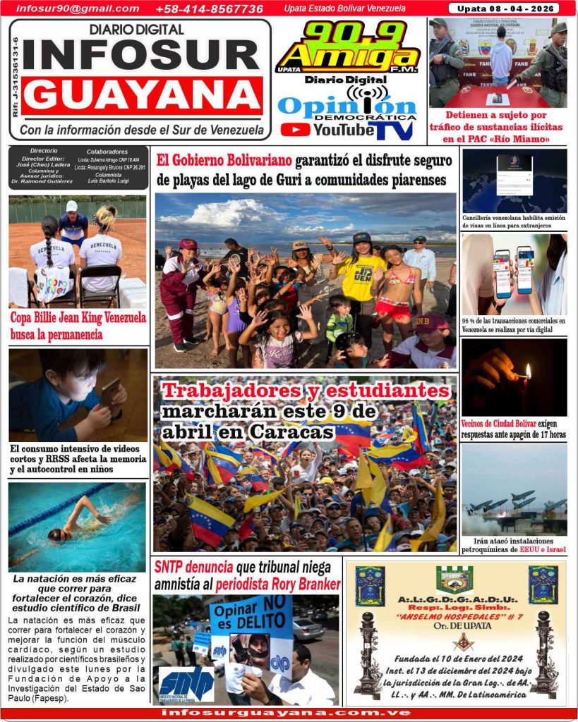 REGIONAL *Portada del Diario Digital InfoSur Guayana del día Miércoles 08 – 04 – 2026* *Descarga nuestra edición en PDF* INFOSUR 07/04/2026 0 Portada INFOSUR EN PDFDescarga Post navigation Previous: Celebran exitoso desarrollo del Ciudad Bolívar Fest 2026Next: ¡Vuelve a Brillar la Música! Wilfrido Vargas Rinde Homenaje a Rubby Pérez con ‘Eternamente Rubby’ Más historias REGIONAL Podemos: «El levantamiento de sanciones solo beneficia al pueblo de Venezuela» INFOSUR 15/04/2026 0 REGIONAL Alcalde Vicente Rojas inspecciona y ordena obras de drenaje en el sector Zabaleta de Tumeremo (+FOTOS) INFOSUR 15/04/2026 0 REGIONAL Gobierno Bolivariano atendió a 8 mil familias: Despliegan plan de saneamiento en la red de aguas servidas del municipio Gran Sabana INFOSUR 14/04/2026 0 Deja un comentario Cancelar la respuestaLo siento, debes estar conectado para publicar un comentario.