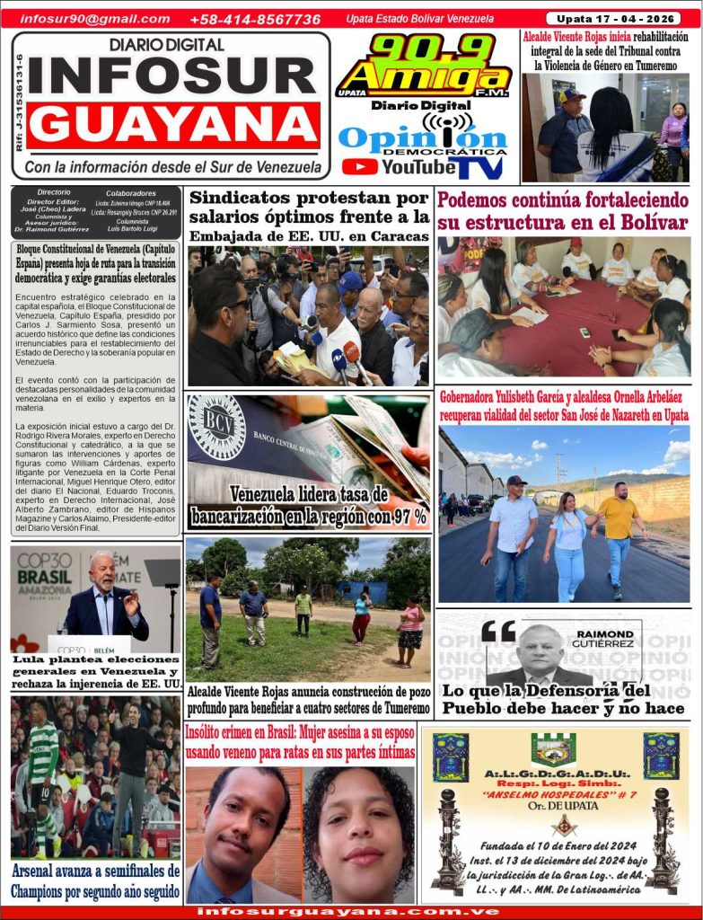 EDICION DIGITAL *Portada del Diario Digital InfoSur Guayana del día Viernes 17 – 04 – 2026* *Descarga nuestra edición en PDF* INFOSUR 17/04/2026 0 PORTADA INFOSUR DIGITALDescarga Post navigation Previous: Autoridades se pronuncian sobre incendio en la UBV Bolívar Más historias EDICION DIGITAL *Portada del Diario Digital InfoSur Guayana del día Jueves 16 – 04 – 2026* *Descarga nuestra edición en PDF* INFOSUR 15/04/2026 0 EDICION DIGITAL *Portada del Diario Digital InfoSur Guayana del día Miércoles 15 – 04 – 2026* *Descarga nuestra edición en PDF* INFOSUR 15/04/2026 0 EDICION DIGITAL *Portada del Diario Digital InfoSur Guayana del día Martes 14 – 04 – 2026* *Descarga nuestra edición en PDF* INFOSUR 14/04/2026 0 Deja un comentario Cancelar la respuestaLo siento, debes estar conectado para publicar un comentario.