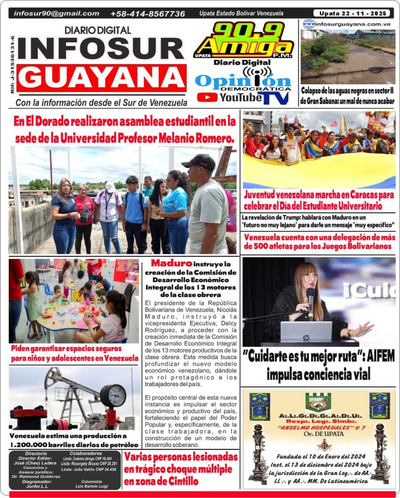 EDICION DIGITAL *Portada del Diario InfoSur Guayana correspondiente del día 22 – 11 – 2025 descarga la edición en el siguiente link* INFOSUR 21/11/2025 0 Portada DIGITAL INFOSUR GUAYANA PDF 11Descarga Post navigation Previous: En El Dorado realizaron asamblea estudiantil en la sede de la Universidad Profesor Melanio Romero.Next: Alcalde VICENTE ROJAS invita al pueblo de Sifontes a participar en la 4ta Consulta Popular 2025, mañana domingo 23 de noviembre. Más historias EDICION DIGITAL *Portada del Diario Digital InfoSur Guayana del día Sábado 25 – 04 – 2026* *Descarga nuestra edición en PDF* INFOSUR 24/04/2026 0 EDICION DIGITAL *Portada del Diario Digital InfoSur Guayana del día Viernes 24 – 04 – 2026* *Descarga nuestra edición en PDF* INFOSUR 23/04/2026 0 EDICION DIGITAL *Portada del Diario Digital InfoSur Guayana del día Jueves 23 – 04 – 2026* *Descarga nuestra edición en PDF* INFOSUR 23/04/2026 0 Deja un comentario Cancelar la respuestaLo siento, debes estar conectado para publicar un comentario.