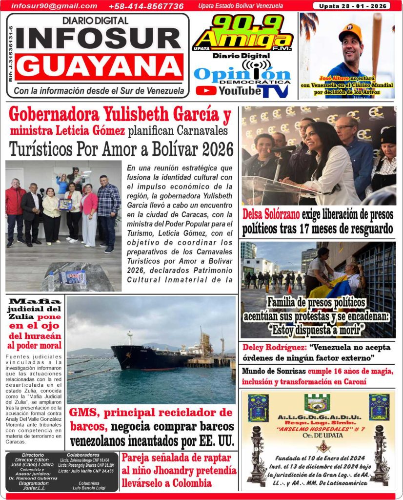 EDICION DIGITAL *Portada del Diario InfoSur Guayana correspondiente del día 28 – 01 – 2026 descarga la edición en el siguiente link* INFOSUR 28/01/2026 0 Portada EDICION INFOSUR PDFDescarga Post navigation Previous: Chile| Venezolano murió baleado mientras reparaba un autoNext: En Caroní familiares de presos políticos exigen sus liberaciones Más historias EDICION DIGITAL *Portada del Diario Digital InfoSur Guayana del día Jueves 16 – 04 – 2026* *Descarga nuestra edición en PDF* INFOSUR 15/04/2026 0 EDICION DIGITAL *Portada del Diario Digital InfoSur Guayana del día Miércoles 15 – 04 – 2026* *Descarga nuestra edición en PDF* INFOSUR 15/04/2026 0 EDICION DIGITAL *Portada del Diario Digital InfoSur Guayana del día Martes 14 – 04 – 2026* *Descarga nuestra edición en PDF* INFOSUR 14/04/2026 0 Deja un comentario Cancelar la respuestaLo siento, debes estar conectado para publicar un comentario.